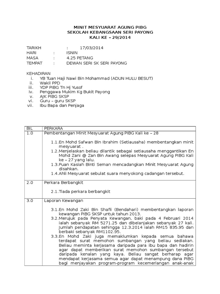 Minit Mesyuarat Agung Pibg Minit Mesyuarat Persatuan Ibu Bapa Dan Guru
