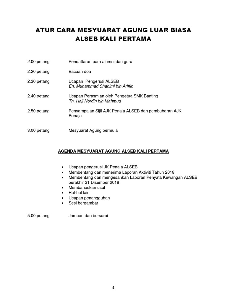 4 Atur Cara Mesyuarat Agung Luar Biasa Alseb Kali Pertama Pdf